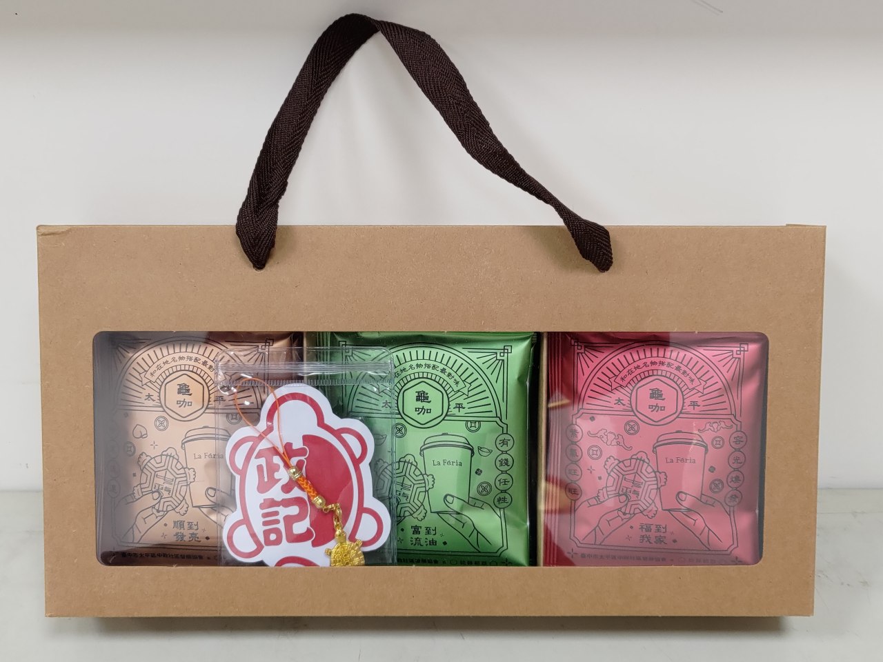 禮盒則內涵3種咖啡各5包(紅包(福),表幸福;綠包(祿),表財富;黃包(禧),表好運,及1個金龜吊飾(壽)。