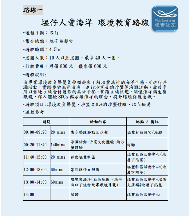 由專業環境教育導覽員帶領遊客了解塭豐漁村的海洋生態,可進行淨灘活動,實際參與海岸清潔,進行沙窯、釣沙蟹、抓沙蟹等活動,最後享用以當地永續食材製作的美味午餐,實踐永續旅遊,關懷海洋與生態環境,深入體驗SDGs與永續海洋的理念,提升環境保護意識。
