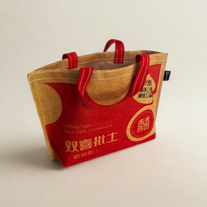 再生循環材料:採用廢棄水泥牛皮紙袋(PE淋膜)手工製作,防潑水且耐用,實踐環保理念。