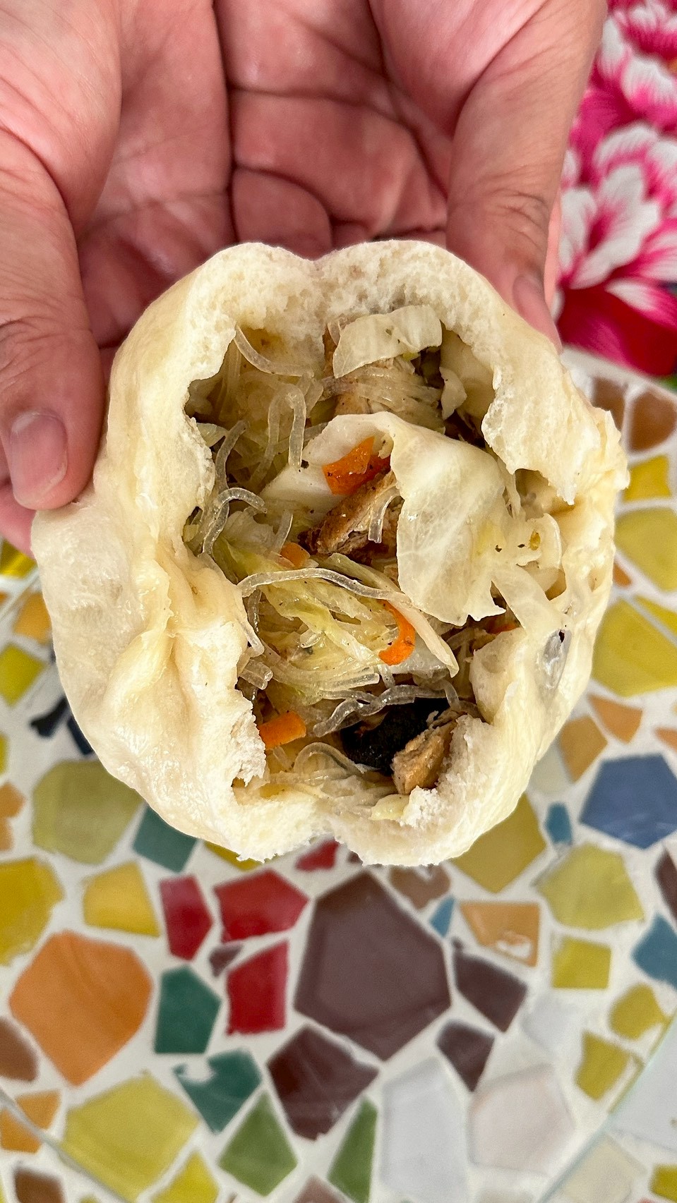 Q彈的包子皮包裹著滿滿的高麗菜餡,拌入冬粉、香菇、豆皮、素火腿提味,鹹香中帶著蔬菜鮮甜。